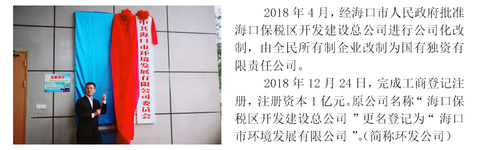 海口市環(huán)境發(fā)展有限公司是海口市屬國有獨資有限責任公司,于2018年12月正式掛牌運營,注冊資本1億元,由1993年12月成立的海口保稅區開發(fā)建設總公司進行公司化改制而成,核心業(yè)務為環(huán)境環(huán)衛(wèi)產業(yè)投資和運營、資產運營和管理,培育業(yè)務為工程管理